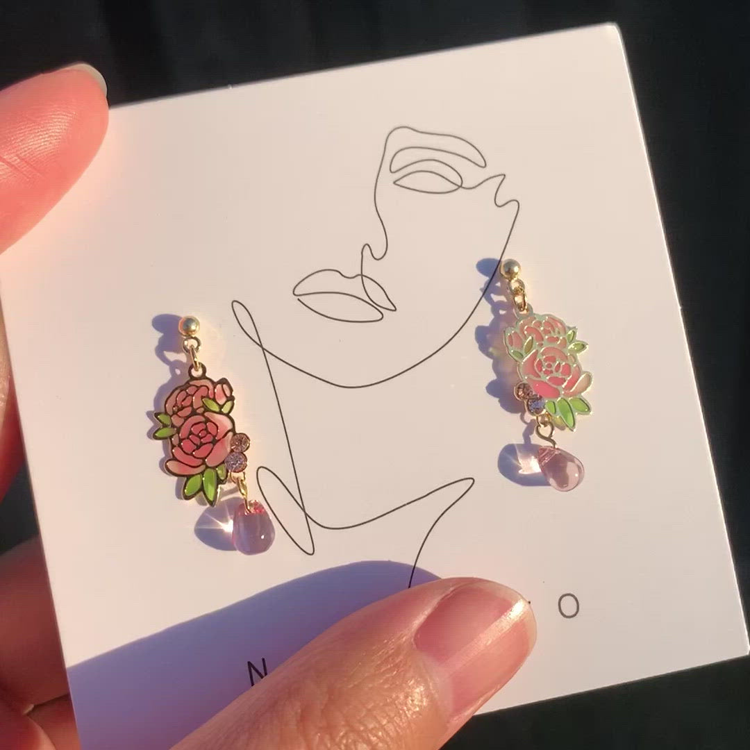 Asymmetric Elegant Engrave Pink Chinese Peony Enamel Resign Earrings (S925 Post)