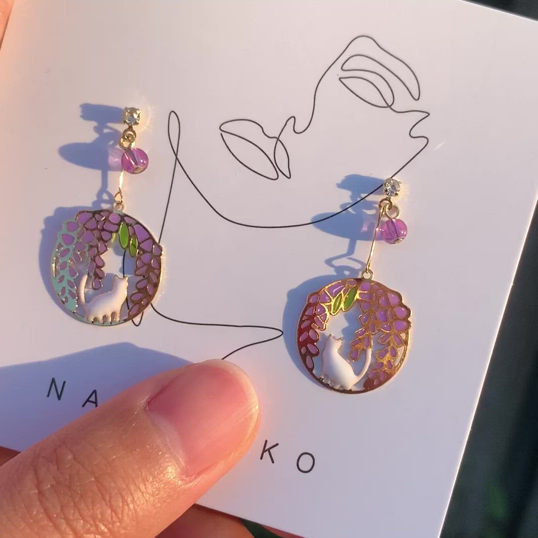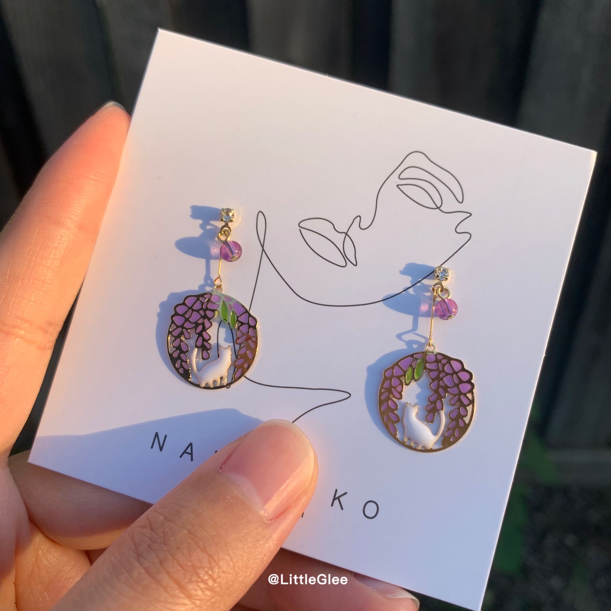 Wisteria Garden Cat Enamel Hand Painted Earrings (S925 Post)